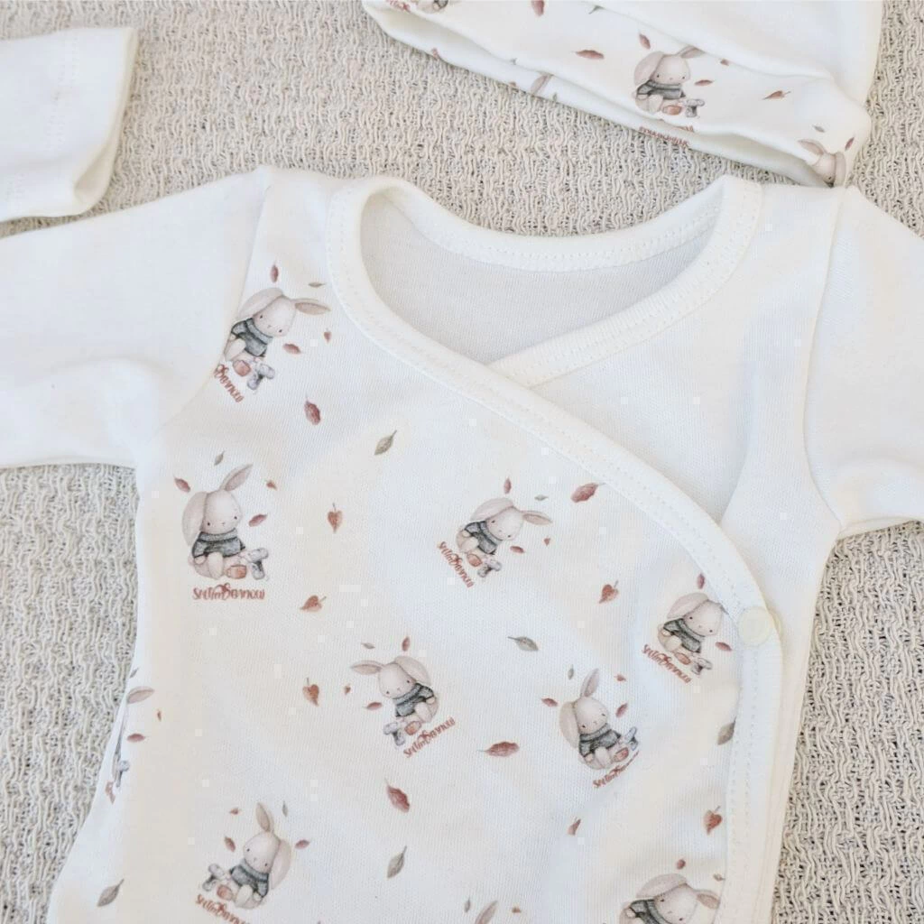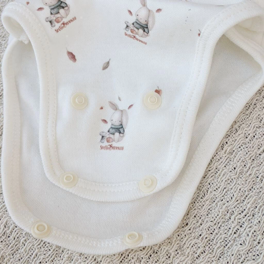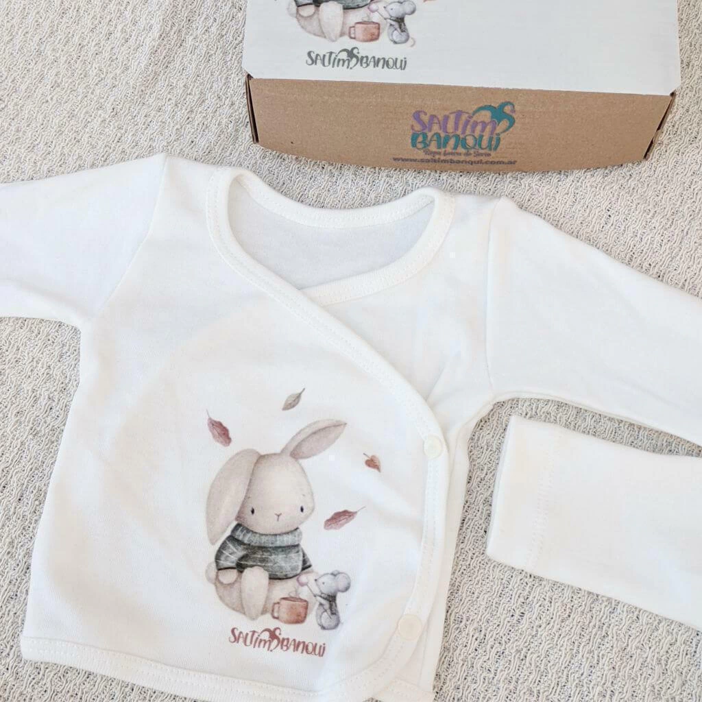 Confeccionado en interlock pima 100% algodón, una tela super suavecita e hipoalergénica, con estampa exlusiva Saltimbanqui. Este diseño, con un conejito estilo vintage es unisex, en colores neutros.